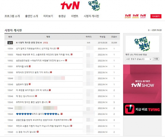 14일 tvN 예능프로그램 '유 퀴즈 온 더 블럭'(이하 '유퀴즈') 공식 홈페이지의 시청자 게시판에는 시청자들의 항의글이 넘쳐나고 있다.