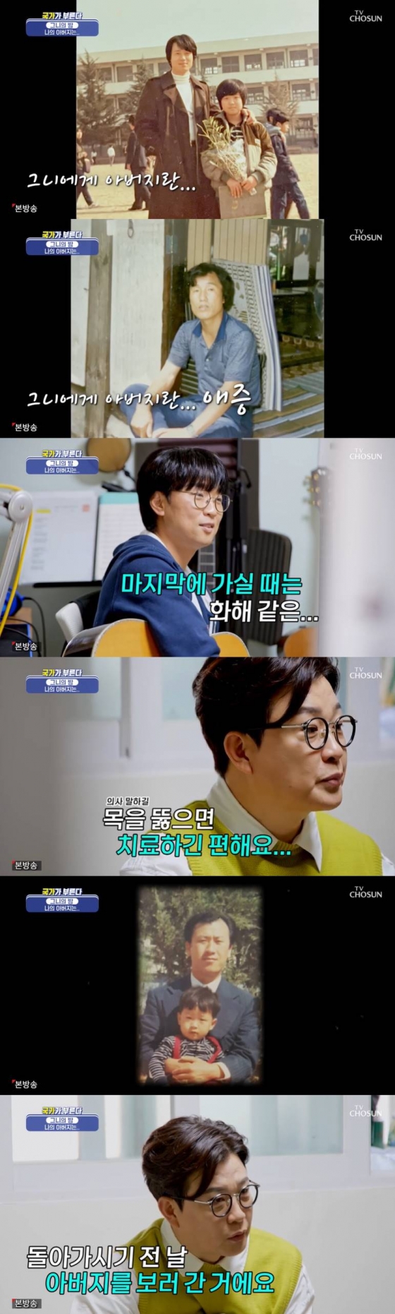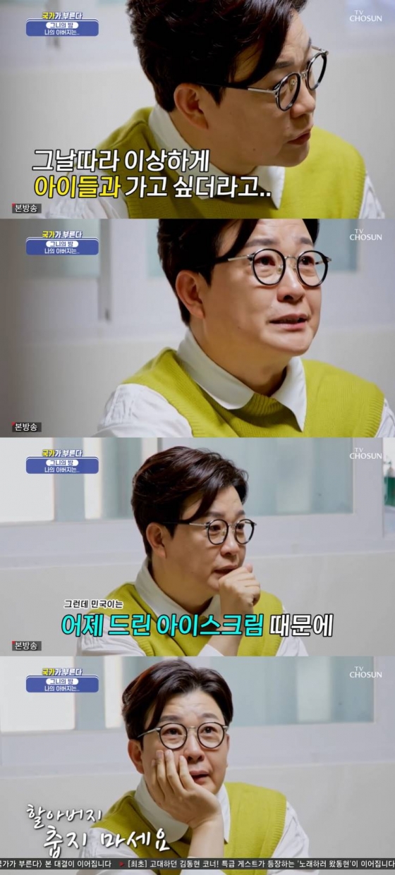 이어 그는 "아버지는 언제나 강한 분인 줄 알았는데 나약해진 모습을 봤다. 돌아가시기 전날 내가 아버지를 보러 간 거다. 그날따라 이상하게 아내와 아이들을 데리고 가고 싶더라. 첫째(민국)가 과자랑 아이스크림을 '할아버지도 드세요'라고 드렸는데 아버지가 눈만 깜빡거렸다. 우리가 괜찮을 거란 말을 듣고 집에 왔는데 다음날 아침에 아버지가 위독하다고 전화가 왔다. 출근 시간이었는데 차가 너무 막혔다. 내가 '아버지 봐야 되는데'라고 생각했지만 아버지가 갔다. 어젯 밤 병원에서 잘 걸 싶었다"고 아버지를 안타깝게 떠나보낸 당시를 떠올렸다.
