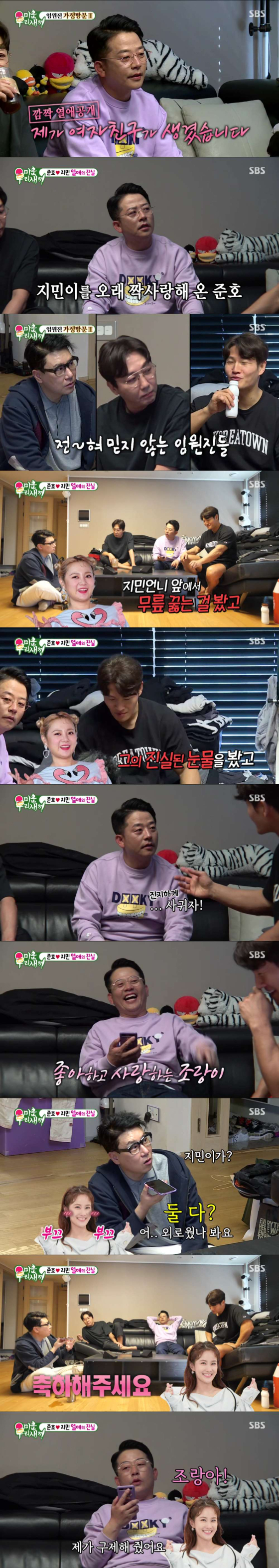 이에 김준호는 "지민이를 내가 오랫동안 짝사랑해왔다"고 고백했다. 그래도 도저히 믿기질 않자 지민에게 전화를 해보라고 했다. 김종국과 이상민이 전화 연결을 시도했으나 받질 않자 김준호는 박나래가 둘 사이를 알고 있다며 박나래에게 전화를 걸었다. 첫 전화에 박나래는 장난인 줄 알고 "둘이 안 사귄다"고 말하고 끊었으나, 이내 다시 전화를 걸어온 박나래는 "저는 준호 선배가 지민 언니 앞에서 무릎 꿇는 걸 봤고, 그의 진실된 눈물을 봤다"라고 말했다.