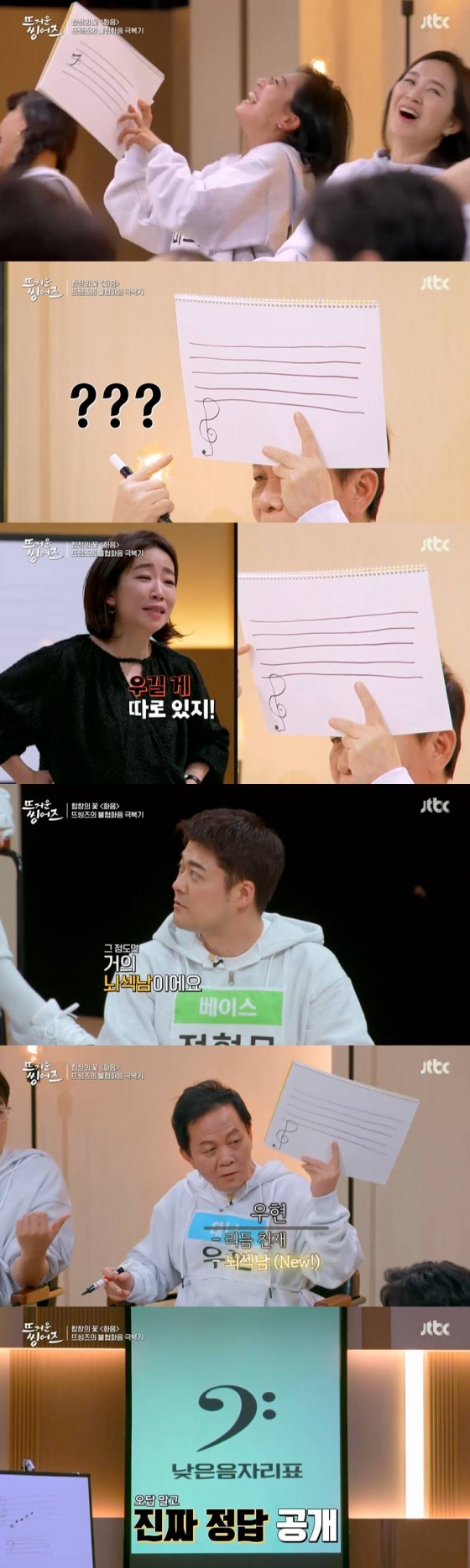 김광규는 오선지에 플랫 세 개를 그리고 낮은음자리표라고 했고, 우현은 오선지 밑에 높은음자리표를 그려 모두를 웃겼다. 여성 단원들은 우현에게 "귀여워"라며 웃었다.