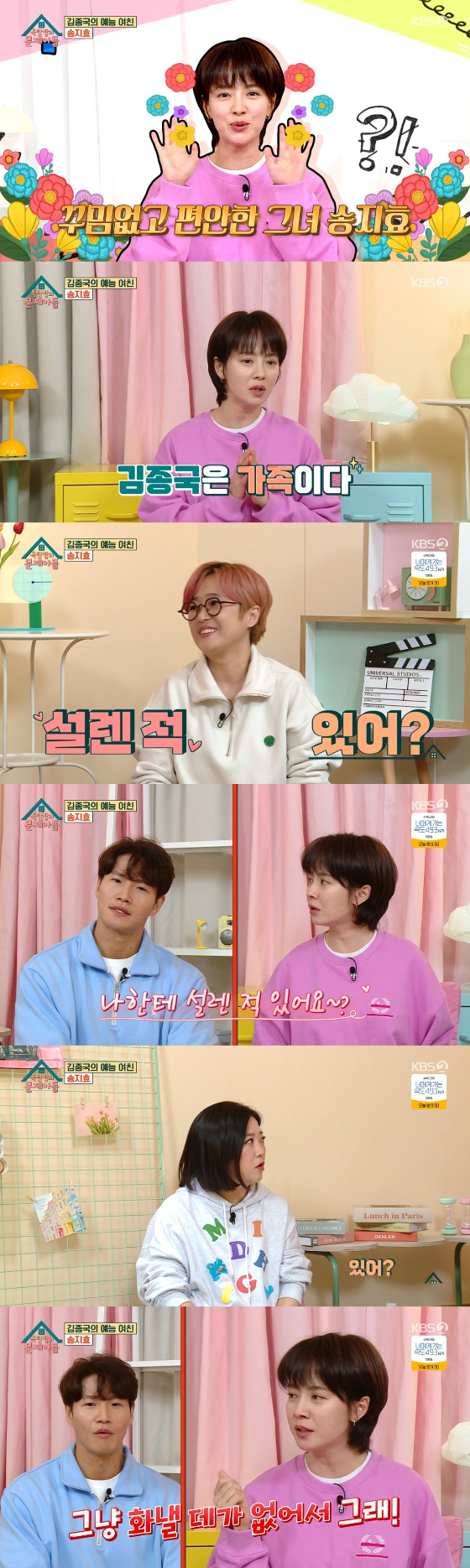 송지효와 김종국은 12년째 알고 지낸 사이로 예능 '런닝맨'도 함께 했다. 이에 송은이는 송지효에게 "서로 설렌 적 없냐"고 물었고, 송지효는 김종국에게 "오빠 나한테 설렌 적 있어요?"라고 했다. 이에 김종국은 "설렌 적은 없죠. 가족 같다고 얘길 하잖아요. 진짜 가족 같다"라고 설명했다.