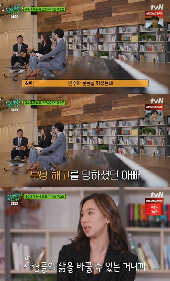특히 부친이 이소은이 로스쿨을 가는 데에 많은 영향을 끼쳤다고. 이소은은 "아빠가 대학에서 정치학과 교수를 하다가 민주화 운동을 하셨는데 부당해고를 당했다. 그 사건을 법으로 이해하고 싶다는 생각이 들었다"고 밝혔다.