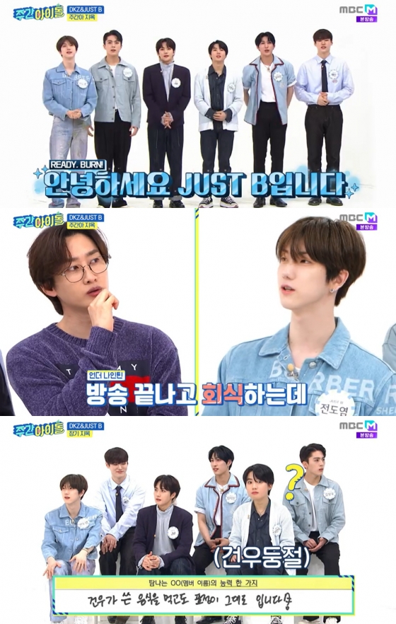 JUST B(임지민, 이건우, 배인, JM, 전도염, 김상우)는 지난 20일 방송된 MBC M 예능프로그램 '주간아이돌'에서 한계 없는 예능감을 드러내며 '꿀잼돌'로 활약했다.