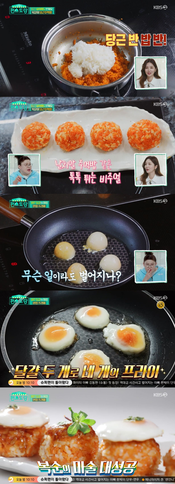 이어 박솔미는 자신이 직접 구운 채소를 활용해 만든 '복순 표 단짠 소스'를 꺼내 함께 볶았다. 밥을 넣으며 "저기에 어쭙잖게 양파가 들어 있으면 '뭐야 채소만 있잖아'라고 한다"라며 "오로지 당근에만 집중하는 거다"고 전했다. 또 박솔미는 삶은 달걀 두 개를 반으로 썰어 프라이팬에 네 조각의 달걀을 올려놨다. 열이 달아오르자 네 개의 달걀 프라이가 만들어졌다. 달걀을 주먹밥 위에 올려놓자, 이연복은 "작품이다"라고 극찬했다.
