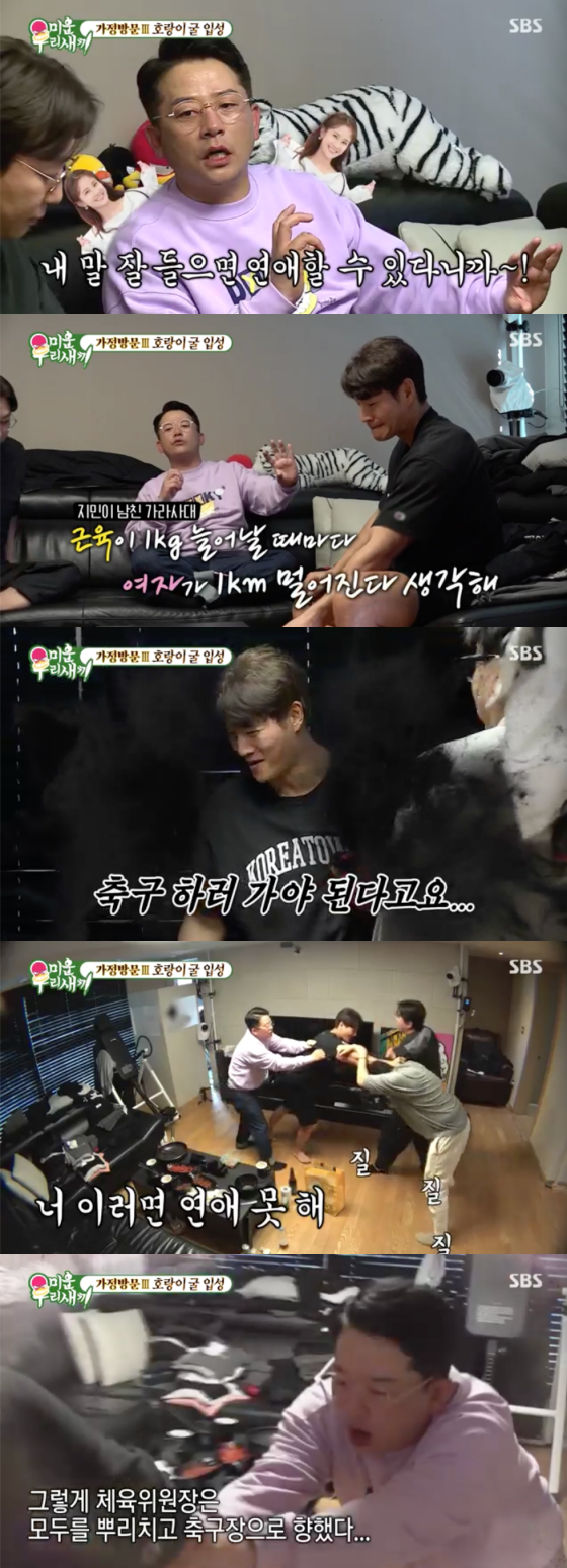 김종국은 세 사람의 잔소리에도 "나의 이런 면을 좋아하는 사람을 만나면 되지. 싫다 하는 것만 고쳐주면 된다"고 심드렁한 모습을 보였다. 김준호는 이에 "내가 배 나오고 근육이 없으니까 사랑이 다가오지 않냐. 연애하려면 운동 좀 줄여야 한다"고 억지 논리를 대며 김종국의 운동 방으로 향했고, 세 사람은 준비해온 김종국 어머니의 사진을 이곳 저곳 붙여 김종국의 분노를 자아냈다.