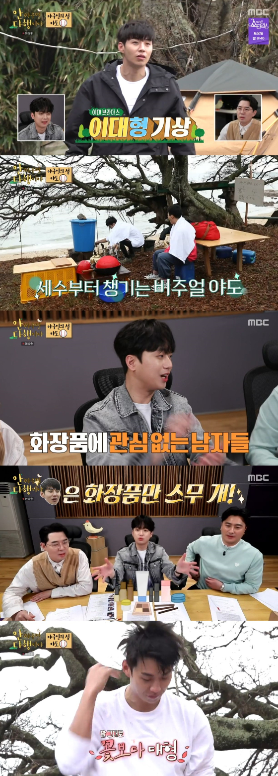 이날 방송에서 이대형 선수는 김병현 다음으로 일찍 일어나 세수를 먼저 했다. 이 모습을 본 이찬원은 "이대형 선수 외모 엄청 신경 쓴다. 이대형 선수 집에 갔다 깜짝 놀랐다"라며 "우리는 보통 스킨로션이나 올인원 쓰지 않냐. 화장대에 화장품이 스무개가 있다. 아이크림 수분 크림 다 바른다"고 설명했다. 이에 붐은 "세럼까지 쓴대요"라고 덧붙이며 놀라움을 자아냈다.