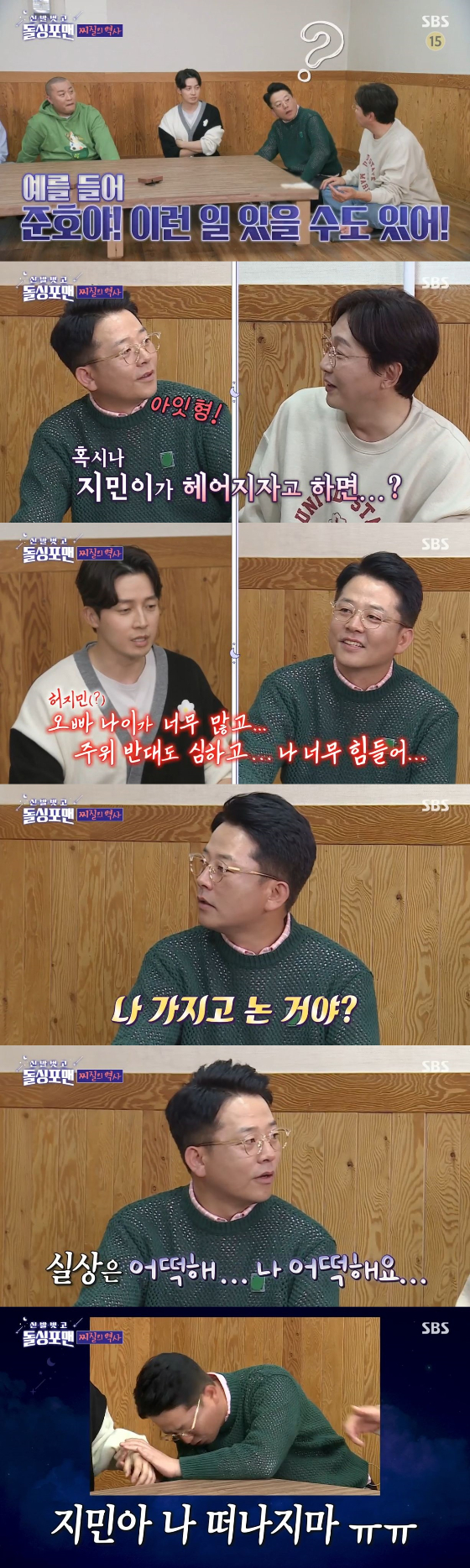 이날 허경환은 여자친구와 이별 후 여자친구에게서 전화 온 상황을 경상도 식으로 연기했다. 허경환은 "왜 전화했노. 헤어지자 안하드나. 사랑, 사랑. 내 니 사랑한 적 없다"고 말하며 폭소를 안겼다. 이를 본 탁재훈은 김준호에게 "예를 들어 이런 일이 있을 수 있다. 지민이가 헤어지자고 하면 어떡할 거냐"고 물었다. 김준호는 "아이 형. 왜 똥을 뿌리냐. 그런 일은 없다"고 거부했다. 하지만 이상민은 "이런 건 미리 생각해 볼 수 있다"고 부추겼다.