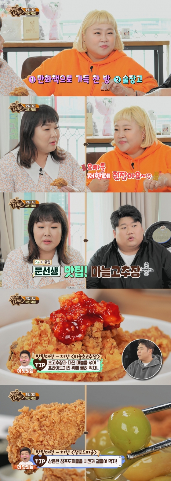 이후 멤버들은 각자 아껴둔 치킨 맛팁을 하나씩 공개했다. 초코 시즈닝 팁, 초고추장 마늘 팁, 와플 버거 팁, 치킨 무로 깍두기 팁, 청포도 피클 팁 등 다양한 맛팁이 공개됐고, 하나같이 군침이 도는 비주얼을 자랑했다는 후문이다. 오는 29일 오후 8시 방송.
