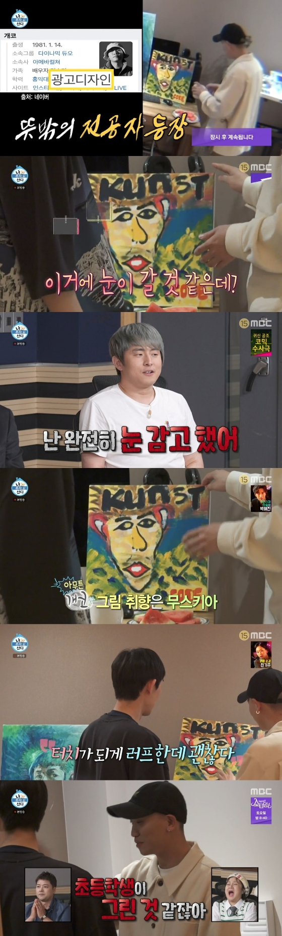 이에 전현무는 "내가 기안이 이겼다"라고 좋아했다. 그러자 기안84는 "나 저거 대충했다. 심심해서 한 거다"고 발을 뺐다. 이에 전현무는 "나도 심심해서 한 거다"고 전했다. 기안84는 "눈 감고 그렸다"며 웃음을 자아냈다. 이어 코드 쿤스트는 "그림을 그리는 이유는 자기 이름에 낙인을 찍기 위해서다"며 전현무가 그린 그림을 그리게 된 계기를 소개했다. 개코는 "순수하다. 그림 자체가 초등학생이 그린 거 같지 않냐"고 말하며 폭소를 안겼다.