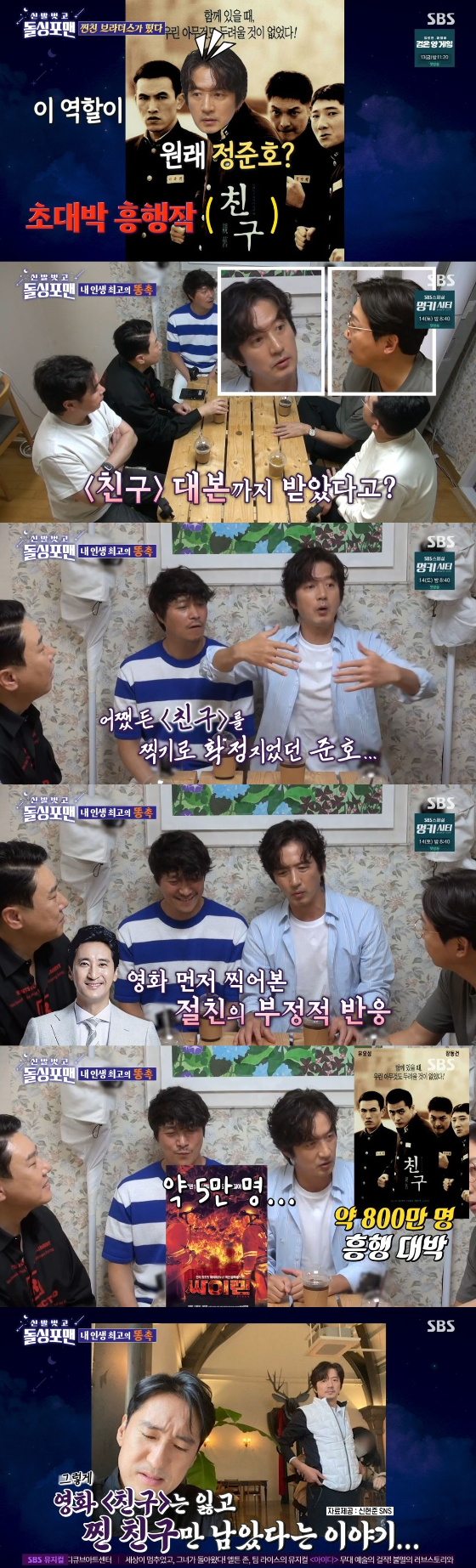 그러면서 "그 영화가 폭삭 망한 '싸이렌'이다"며 한탄했다. 이어 정준호는 '친구' 대본을 장동건에게 건넸다. 정준호는 "장동건은 대본 보더니 '너무 신선하고 재밌겠는데 왜 안 하냐'더라"며 한숨을 쉬며 웃음을 안겼다.