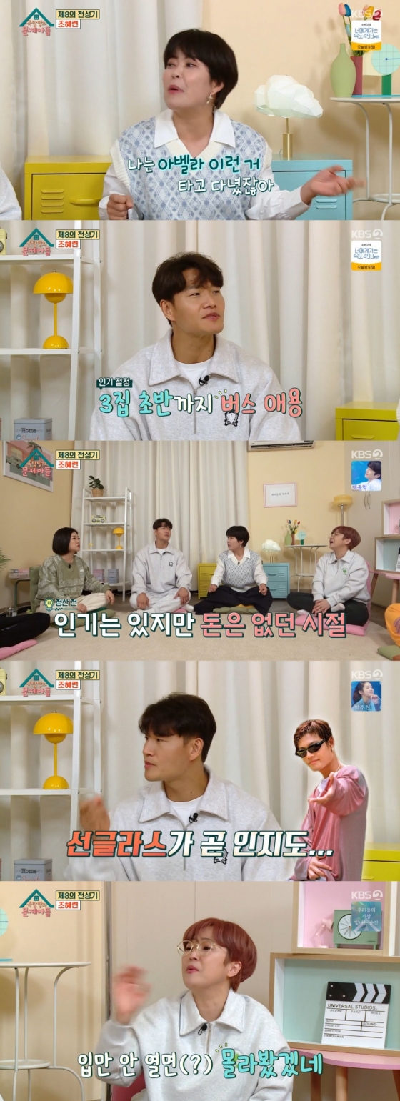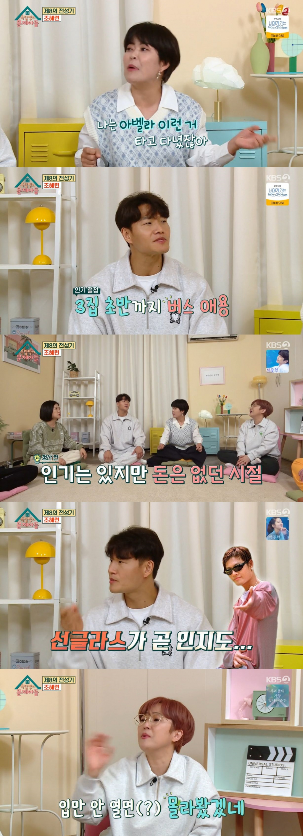 이날 방송에서 조혜련은 "김종국이 짠돌이였다"라고 폭로했다. 조혜련은 "나는 당시 아벨라 이런 거 타고 다녔는데 터보 시절에 인기있었던 종국이가 버스를 타더라"고 설명했다. 김종국은 "3집 초반까지 버스 탔다"라며 "인기는 있는데 돈은 없던 시절이었고, 선글라스를 쓰면 알아보고 안 쓰면 못 알아보는 시절이었다"라고 설명했다. 이에 송은이는 "입을 안 열면 몰라봤겠네"라고 말하며 웃음을 자아냈다.
