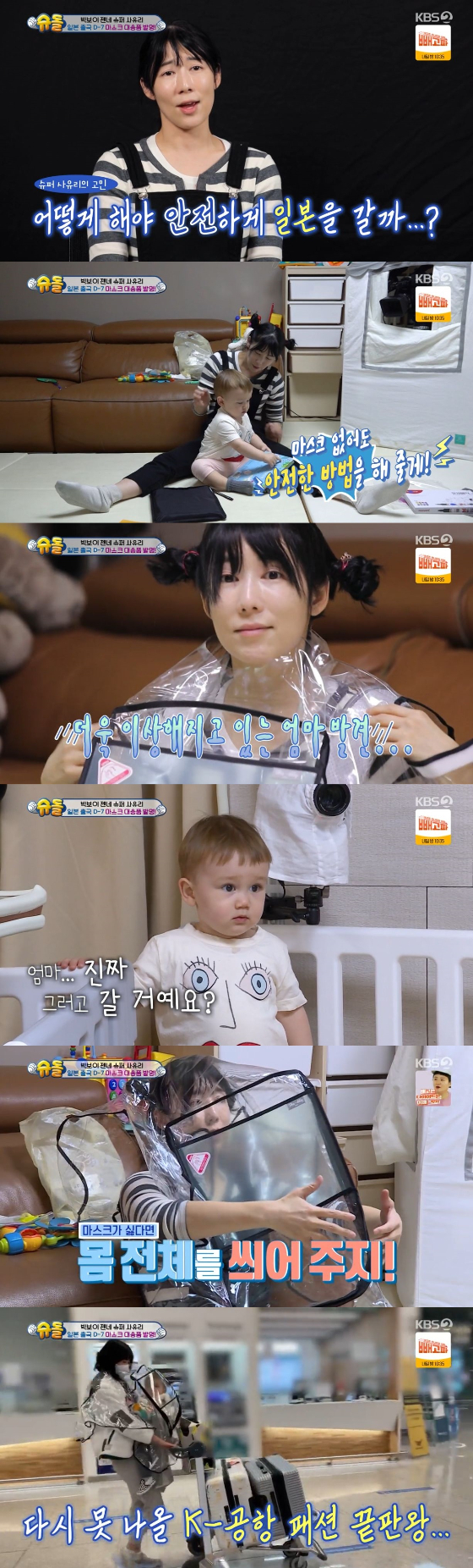 이어 사유리는 젠에게 "마스크 싫으면 엄마가 마스크 없이도 안전한 방법을 만들겠다"고 다짐했다. 사유리는 비닐로 된 유모차 커버를 쓰기로 했다. 사유리는 젠을 아기띠에 태우고 유모차 커버를 뒤집어 씌웠다. 젠은 비닐 커버를 답답해했지만, 실제 공항에서 쓰고 여유롭게 다니는 모습으로 훈훈함을 자아냈다.