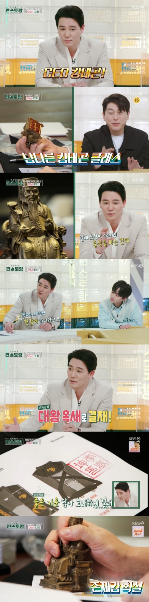 이어 이태곤은 사극에서나 볼 수 있는 옥새 도장을 꺼내 시선을 사로잡았다. 이태곤은 "원래 있는 도장은 아니고 동상인데 종로를 뒤져서 만들었다. 이전까진 펜으로 표시했는데 (직원들이) 잘못 이해하고 엉뚱한 걸 하더라. 그래서 크고 확실하게 보이는 걸로 만들었다"며 남다른 결재도장을 만든 배경을 설명했다.