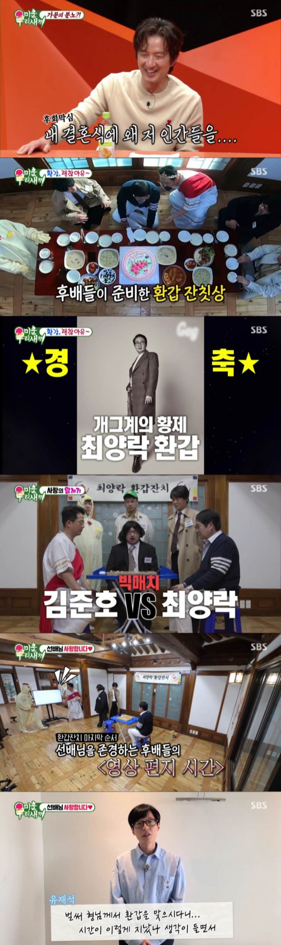 또한 이날 방송에선 개그맨 김준호와 후배 개그맨들이 '개그계의 황제' 최양락을 위해 환갑 잔치를 준비하는 모습이 그려졌다.