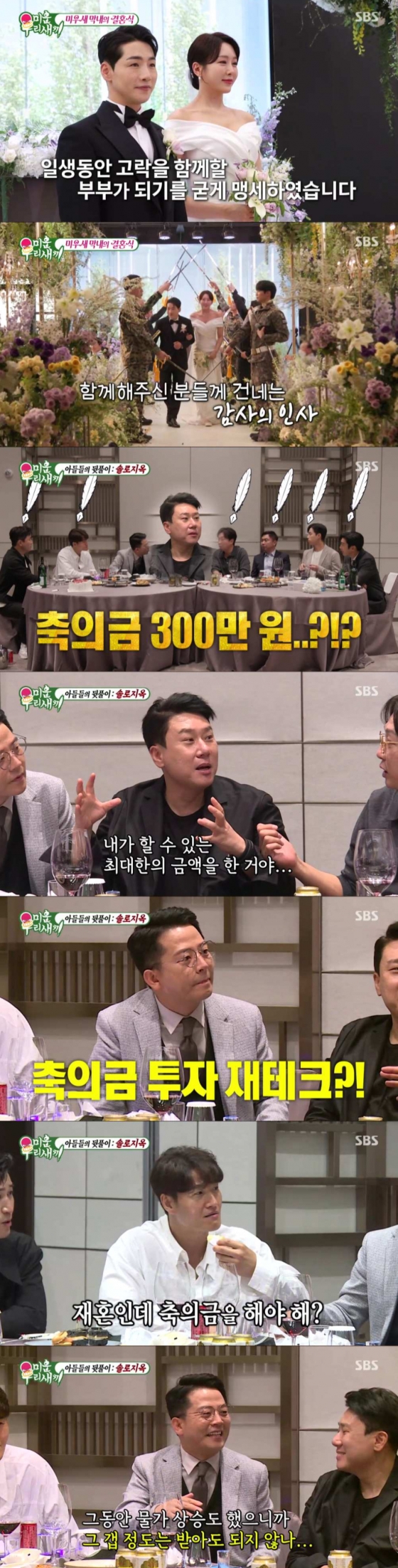 이 가운데, 김종국은 "재혼에도 축의금을 해야하냐"고 의문을 가졌다. 이에 김준호는 "이제 재혼 아니고 새혼이다. 그리고 그동안 물가 상승도 했으니까 그 갭 정도는 받아도 되지 않나"라며 너스레를 떨었다.
