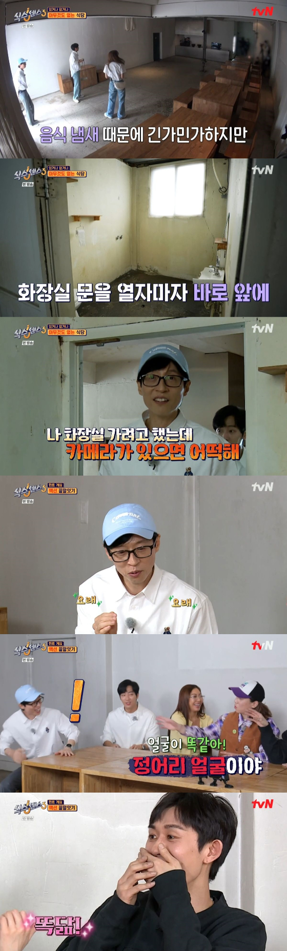이날 방송에서 '식센3' 멤버들과 코쿤, 넉살은 서울시 성동구에 있는 '아무것도 없는 집'인 식당으로 향했다. 창고같이 생긴 식당에는 텅 비어있는 것이 콘셉트였다. 깨진 세면대가 있는 화장실에 들어간 유재석은 "화장실에 카메라가 있으면 어떡하냐"고 소리쳤고, 제작진은 "모자로 덮.."이라며 말을 잇지 못했다. 이에 이상엽은 "바지 만지면서 들어가던데"라고 웃어 재꼈다.