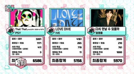 21일 방송된 MBC '쇼! 음악중심'에서는 싸이의 'That That'이 아이브의 'LOVE DIVE', 임영웅의 '다시 만날 수 있을까'를 제치고 1위를 차지했다.