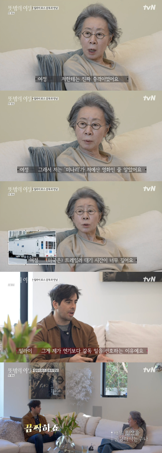 22일 오후 첫 방송된 tvN 예능 프로그램 '뜻밖의 여정'에서는 윤여정과 일라이 로스 감독의 만남이 그려졌다.