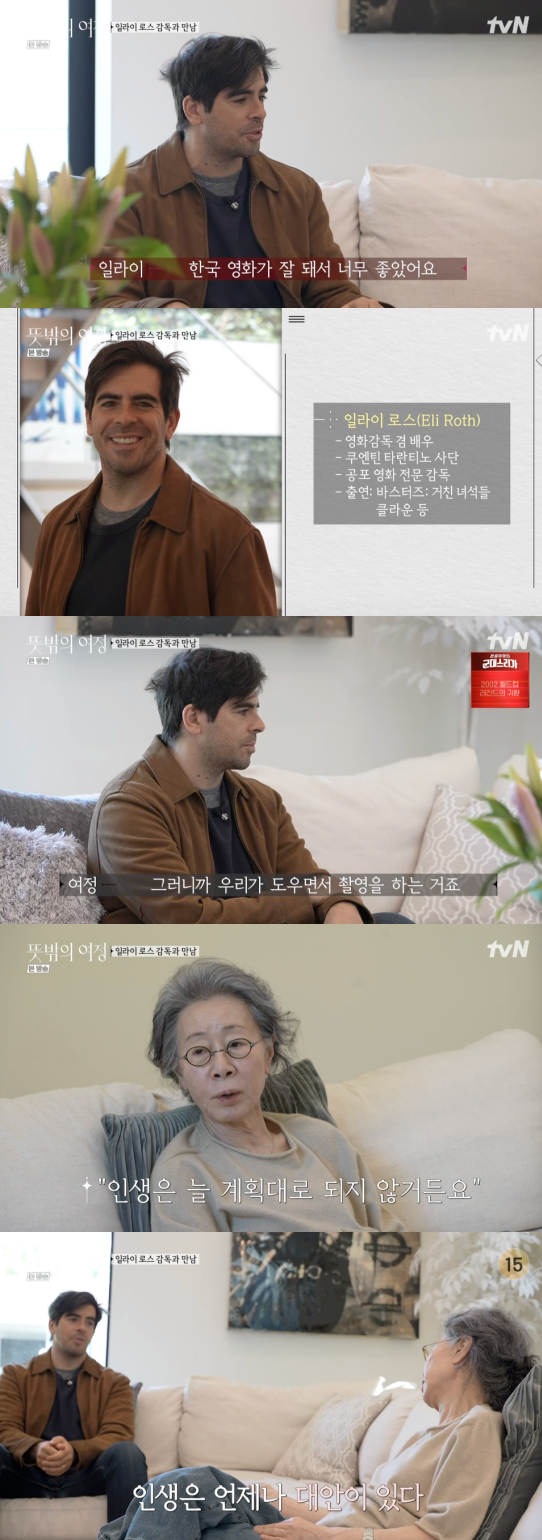 22일 오후 첫 방송된 tvN 예능 프로그램 '뜻밖의 여정'에서는 영화감독 겸 배우 일라이 로스가 윤여정의 숙소를 찾아왔다.