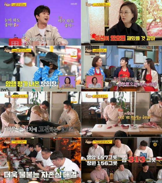 이후 정호영은 속살을 시작으로 끊임없이 회를 건넸고 남다른 먹성을 자랑하는 영암군 씨름단 김기태 감독, 윤정수 코치, 장성우 장사와 창원시청 씨름단 3인은 경쟁적으로 회, 초밥, 우동을 흡입, 총 313 그릇을 해치워 놀라움을 안겼다.
