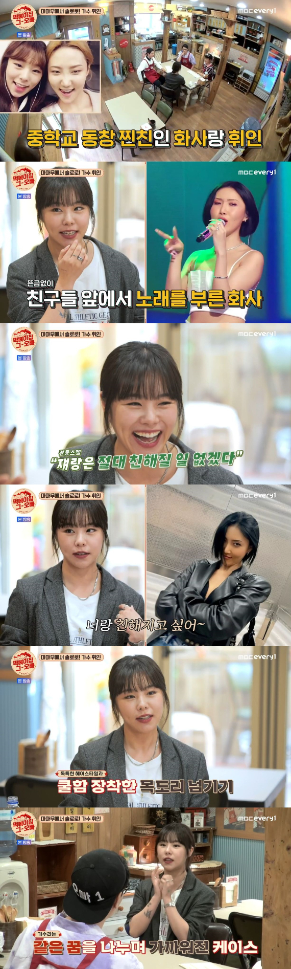 이날 방송에서 휘인은 같은 마마무 멤버 화사의 첫인상에 대해 "화사와 중학교 때 같은 반이 됐는데.. 갑자기 얘가 사물함 앞에서 노래를 막 하더라"며 과거를 떠올렸다. 이어 휘인은 "그거 보고 '아 쟤랑은 절대 친해질 일 없겠다'고 생각했다"며 "관종 같은 모습이 싫었다"고 털어놨다.