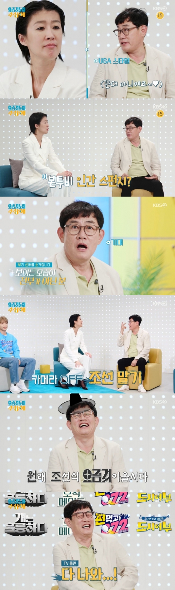 이날 방송에서 이경규는 자신을 "요즘 것들"이라고 소개하며 "USA 스타일이다"고 설명했다. 이어 이경규는 "나는 스펀지 같은 사람이다. 다 흡수시킨다"고 덧붙였다. 이에 홍진경은 "이경규 선배님은 정말 보이는 게 다가 아닌 분이다"며 공감했다.