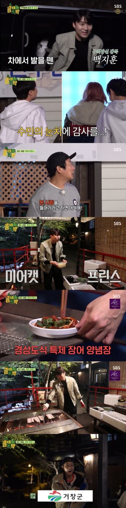백지훈은 멤버들이 볼 수 없는 사각지대에서 열심히 장어를 굽고 있었다. 하지만 눈치 빠른 차수민이 이를 눈치챘고, "언니 우리 들어가자"라며 아무것도 눈치채지 못한 송해나를 이끌고 숙소로 들어갔다. 이에 이진호는 "그래. 수민아. 들어가 있어"라며 고마운 눈빛을 보냈다. 하지만 이수근이 "눈치챈 애를 들여보내면 어떡해. 다 말하면 어쩌려고"라며 말하자 다시 애타게 차수민의 이름을 외쳐 대 웃음을 안겼다.
