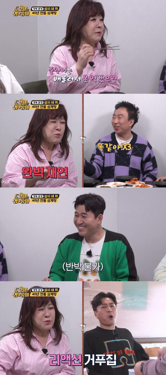 이를 포착한 노사연은 "종민이는 배 불러 못먹겠다고 하면 항상..."이라며 온갖 인상을 찌푸리고 먹는 김종민을 따라했다. 그 모습에 박명수를 비롯한 멤버들은 격하게 공감했고, 김종민 역시 들통난 것처럼 반박하지 못하고 웃음만 보였다.