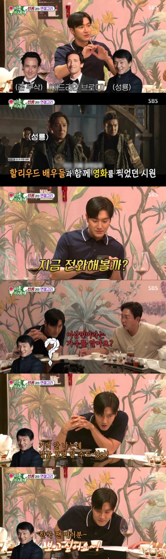 이어 최시원은 존 쿠삭, 애드리안 브로디, 성룡과 함께 영화를 찍었다며 "지금 전화해볼까?"라며 성룡과 전화 연결에 성공했다. 성룡은 "지금 어디야? 중국 언제 올 거냐"라며 반가워했고, 최시원은 "한국이다. (중국 언제 갈지) 잘 모르겠다"고 전했다. 또 최시원이 "이상민이라는 가수를 아냐"라며 묻자 성룡은 "기억은 안 나는데 얼굴 보면 알 수도 있다"고 말해 눈길을 끌었다.