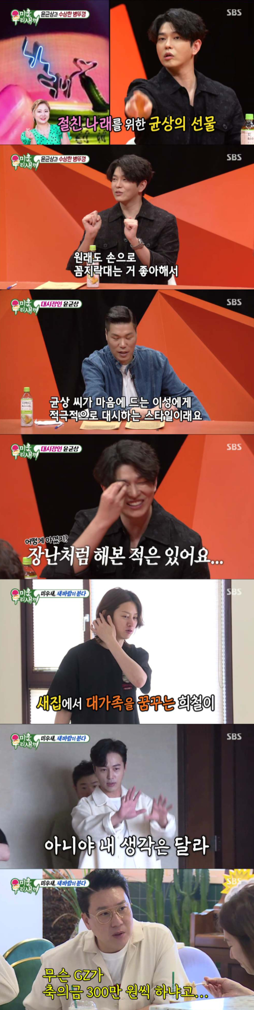 이날 스페셜 MC로는 배우 윤균상이 출연했다. 대주가로 알려진 윤균상은 술을 자주 마시다 보니 병뚜껑으로 다양한 작품을 만들었다고 전해 눈길을 끌었다. 특히 소주 뚜껑으로 '나래 하트' 모양을 만든 모습이 공개되자 MC들과 어머님들은 "하트가 수상하다"며 예리하게 바라봤다.