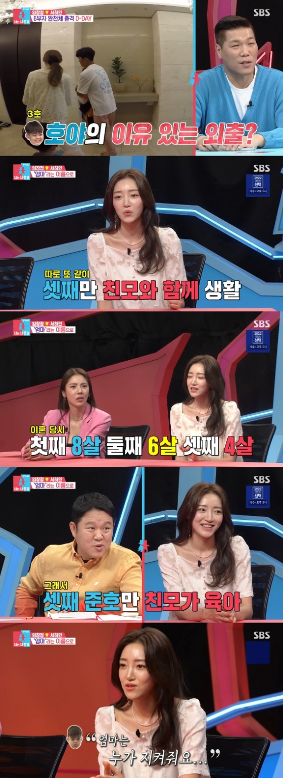 서하얀은 "언젠가 호야한테 그런 말을 했다. 호야는 언제 형들이랑 같이 살 거냐고 물어보니까 호야가 '나까지 이쪽으로 오게 되면 엄마는 누가 지켜줘요'라더라"고 설명했다. 이어 서하얀은 "그 말을 듣는 순간 저도 마음이 울컥하고. 엄마 마음을 이제 알아서 호야도 하고 싶은 대로 하게 했다"라고 전했다.