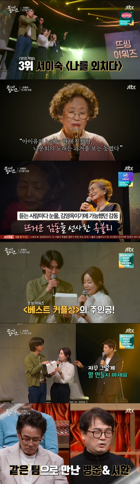 이날 김광규의 화려한 무대를 시작으로 본격적인 시상식이 시작됐고, 총 8개 부문 가운데 첫 시상부문은 '앗! 뜨거상'이었다. '앗! 뜨거상'은 시청자가 뽑은 대상 격으로, 인터넷 클립 영상에서 최고 조회수를 기록한 Top 3에 주어졌다. 서이숙은 약 100만 뷰를 기록한 '나를 외치다' 영상으로 '앗! 뜨거상' 3위를 가져갔다. 전현무는 "'고작 서른되고 늙는 것에 대한 두려움이 있었는데 이 분 보니 나이들고 싶다'" 등의 댓글을 읽으며 열띤 반응을 얻었던 서이숙의 영상에 대해 설명했다. 이어 Top2는 약 200만 뷰를 기록한 나문희의 '나의 옛날 이야기'에게로 돌아갔다. 시청자는 "아이유의 노래는 현재 진행형, 나문희의 노래는 과거를 보는 듯 했다"며 극찬했다. 대망의 Top1은 김영옥의 '천개의 바람이 되어'로 돌아갔다.