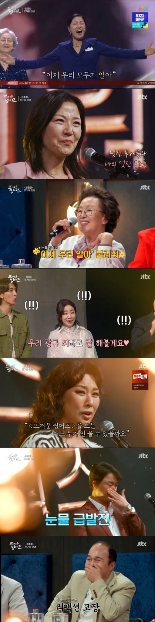 이날 웃음폭탄은 '수도꼭지상' 부문에 있었다. '수도꼭지상'을 수상한 이종혁, 정영주, 박준면, 최대철 4인방의 눈물 활약상이 담긴 영상이 공개되자 단원들은 웃음을 멈추지 못했다. 뿐만 아니라 남다른 감수성으로 자주 울컥하는 4인방은 이날 수상소감에서도 예외가 아니었다. 특히 최대철은 입을 떼자마자 눈물 급발진을 보이며 단원들을 박장대소하게 만들었다. 이어 정영주는 "제가 갱년기인 걸 알고 시작했다. 그런데 '뜨거운 씽어즈'를 보는 어느 누가 안 울 수 있을까요"라고 말하며 프로그램에 대한 애틋함을 전했다.