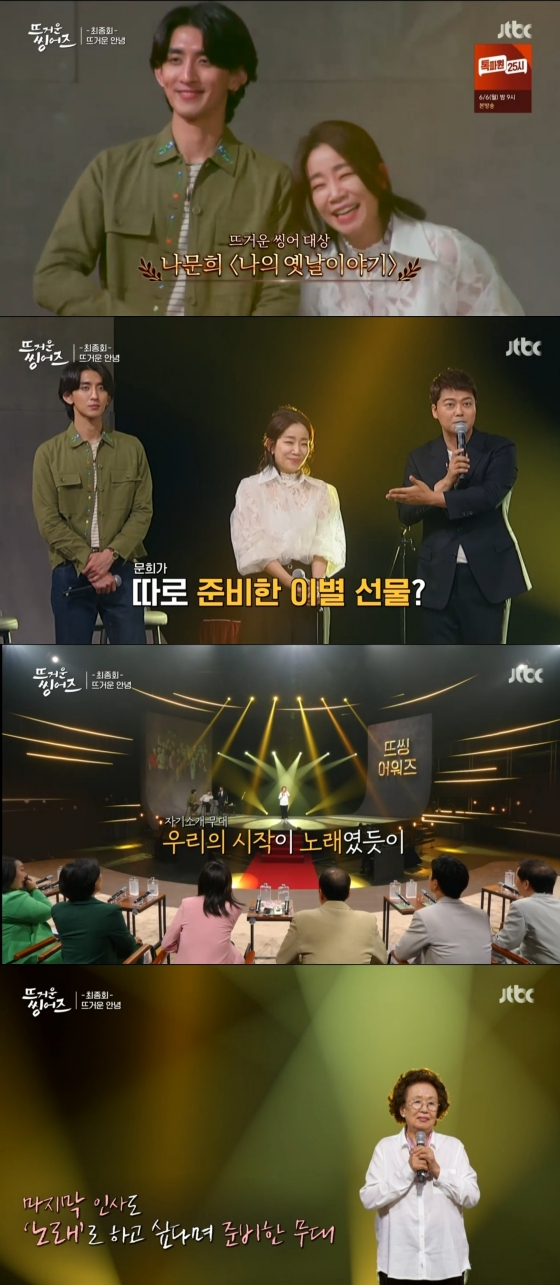프로그램 말미에는 대상 수상자인 나문희가 직접 준비한 이별선물이 담겼다. 나문희는 단원들과의 첫 만남에서 그러했듯 의미있는 무대를 준비했고, 패티김의 '이별'을 선곡했다. '뜨거운 씽어즈'는 프로그램 첫 무대에 오른 나문희가 마지막 무대까지 장식하는 수미상관 엔딩을 맺으며 뜨거운 피날레를 맺었다.