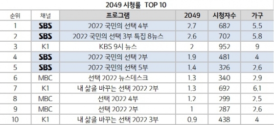 지난 1일 방송된 SBS 선고방송은 2049시청률 TOP10에서 1,2,4,6위를 휩쓸었다. 선거 결과가 나오기 시작하면서 긴장감이 고조되던 순간 SBS 국민의 선택 4부는 2049 시청률 2.7%로 KBS 2.0%, MBC 1.3%를 크게 따돌리며 1위를 차지했다. 2위 역시 한 시간 앞서 방송된 SBS8뉴스로 2049시청률은 2.6%다.