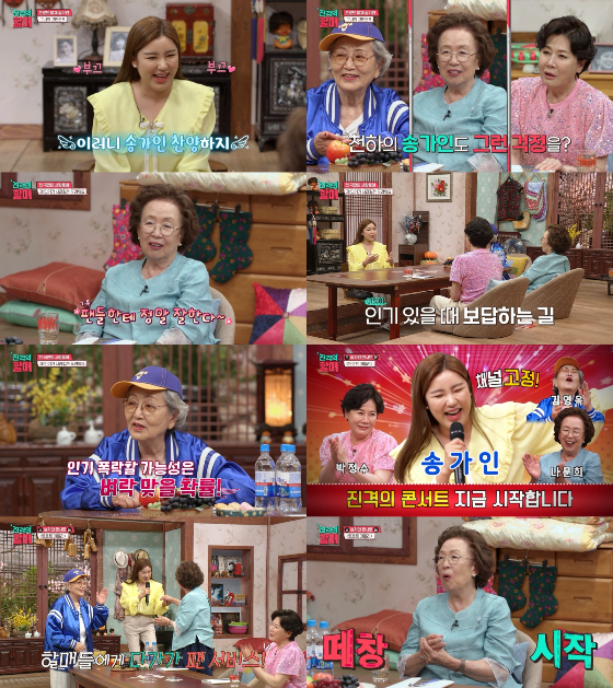 '트롯퀸' 송가인이 '진격의 할매'에서 김영옥, 나문희, 박정수의 따뜻한 조언으로 고민을 해결하고 미니 콘서트를 선보이며 감사한 마음을 전했다.