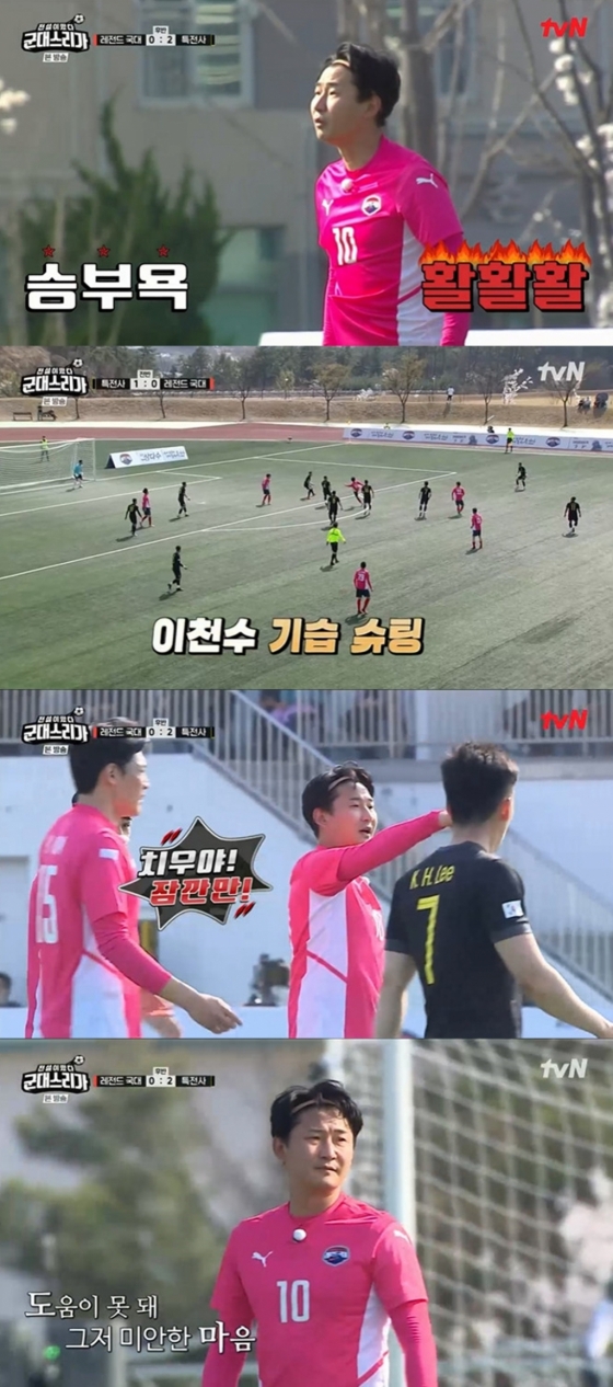 이천수는 지난 13일 월요일 오후 8시 40분 방송한 tvN 예능 프로그램 '전설이 떴다-군대스리가'(이하 '군대스리가')에서 '레전드 국대'의 스트라이커로 날카로운 공격 본능을 뽐냈다.