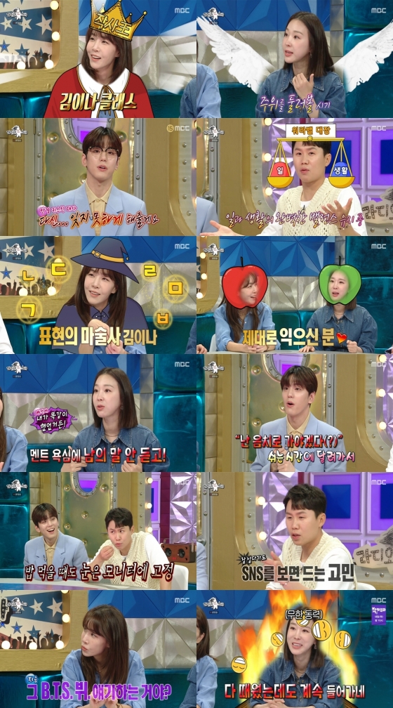 이날 김이나는 '언금술사' 다운 착 달라붙는 어록과 입담을 자랑하며 4MC를 사로잡았다. 특히 '하트시그널' 덕분에 방송인으로서 재미를 찾았다고. 그는 "비유를 하면 사람들이 많이 공감한다"라며 어록 공장장 재능을 인정받았다고 이야기했다. 또 라디오 DJ를 맡고 있는 '별밤'에 방탄소년단 뷔가 신청곡 사연을 보낸 일화를 꺼냈다. 이어 김이나는 뷔의 개인 앨범 작업에 도움을 줬다고 덧붙여 기대감을 높였다.