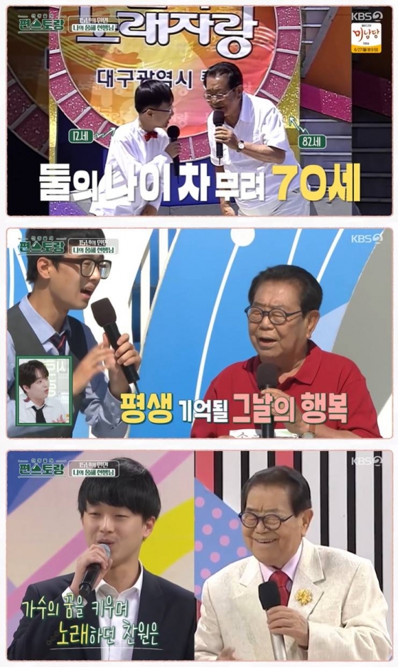 그는 24세 대학생이 돼서 또 '전국노래자랑' 무대에 올라 송해와 세 번째 만남을 가졌다. 이찬원은 송해와 당시에도 듀엣 무대를 가졌고, 데뷔 후 송해 앞에서 노래를 부르는 대견한 가수가 됐다.