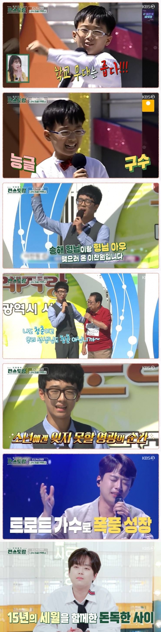 이찬원은 고등학교 2학년 때 '진또배기'로 또 한 번 '전국노래자랑' 무대에 섰다. 그는 "그때 송해 선생님과 남인수의 '청춘고백' 노래를 같이 듀엣으로 불렀다. 잊을 수 없는 노래"라고 말했다.