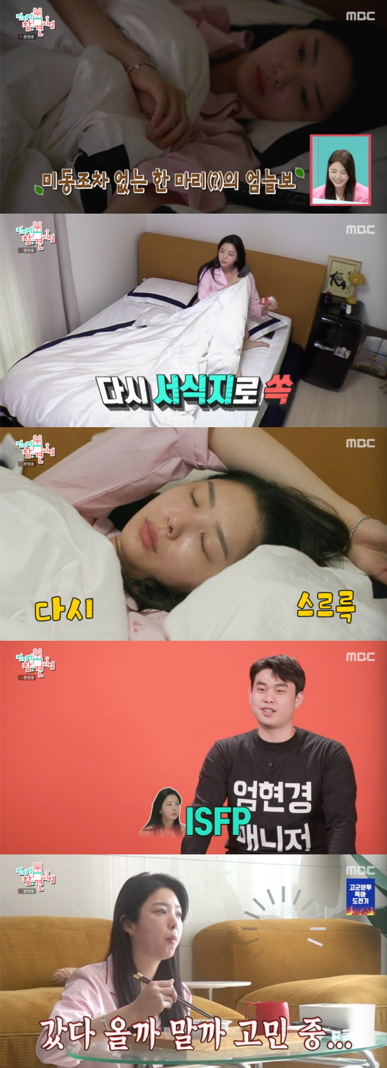 스튜디오는 나무늘보처럼 침대에 꼼짝않고 잠든 그녀가 저녁 9시에 잠들어 아침 7시에 일어난다는 말에 깜짝 놀랐다. 양세형은 "10시간을 자는 거냐"고, 홍현희는 "초등학생이네"라며 놀랐고, 그녀의 매니저는 "제가 MBTI를 안 믿는데 ISFP 특징을 찾아보니 다 누나더라"며 "침대랑 한 몸인 게 특징이더라"고 밝혀 웃음을 더했다.