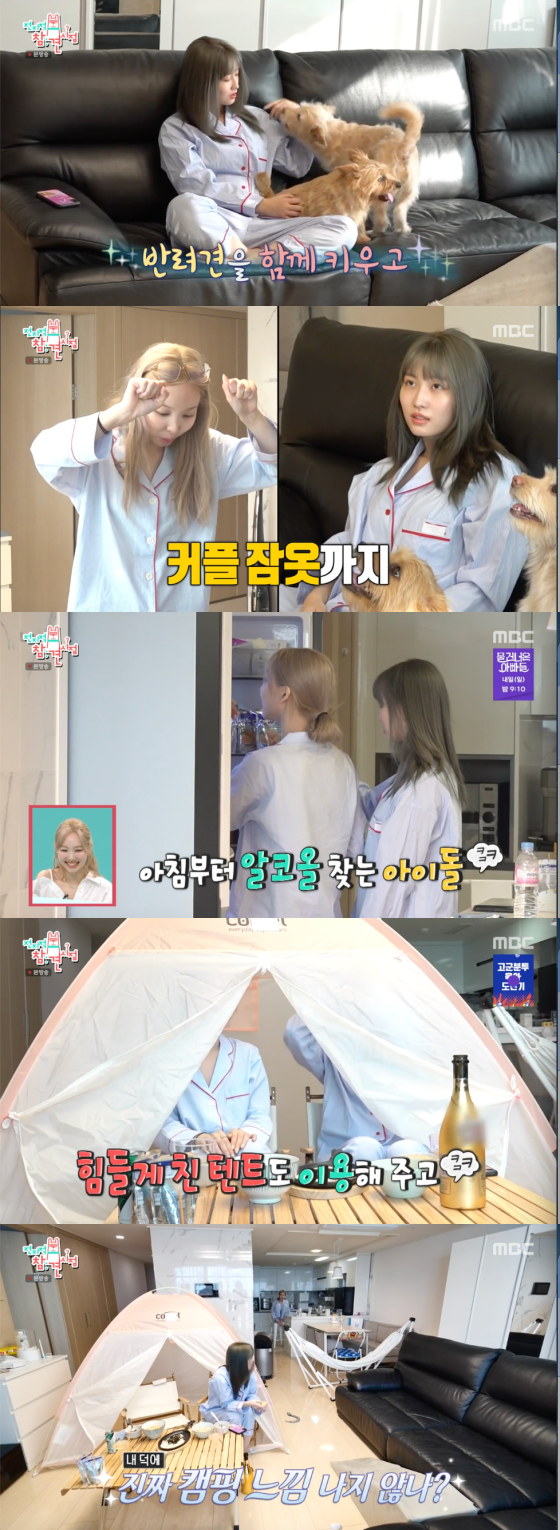 나연과 모모는 부와 도비라는 반려견을 함께 키우며 커플 잠옷까지 공개해 눈길을 끌었다. 나연은 이에 "같이 산 게 아닌데 비슷한 걸 샀다"고 설명해 놀라움을 더했다. 두 사람은 또 거실에서 노는 걸 좋아한다며 텐트를 설치해 방구석 캠핑을 즐겼다.