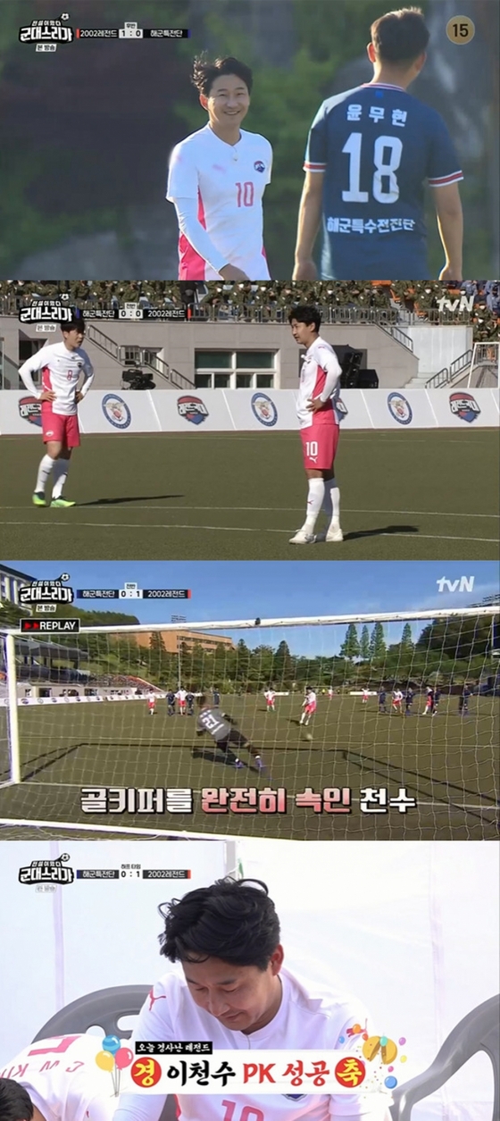 이천수는 지난 27일 월요일 오후 8시 40분 방송한 tvN 예능 프로그램 '전설이 떴다-군대스리가'(이하 '군대스리가')에서 '레전드 국대'의 공격수로 UDT(해군특수전전단)와 SSU(해군해난구조전대)가 연합한 해군 드림팀의 골문을 위협했다.