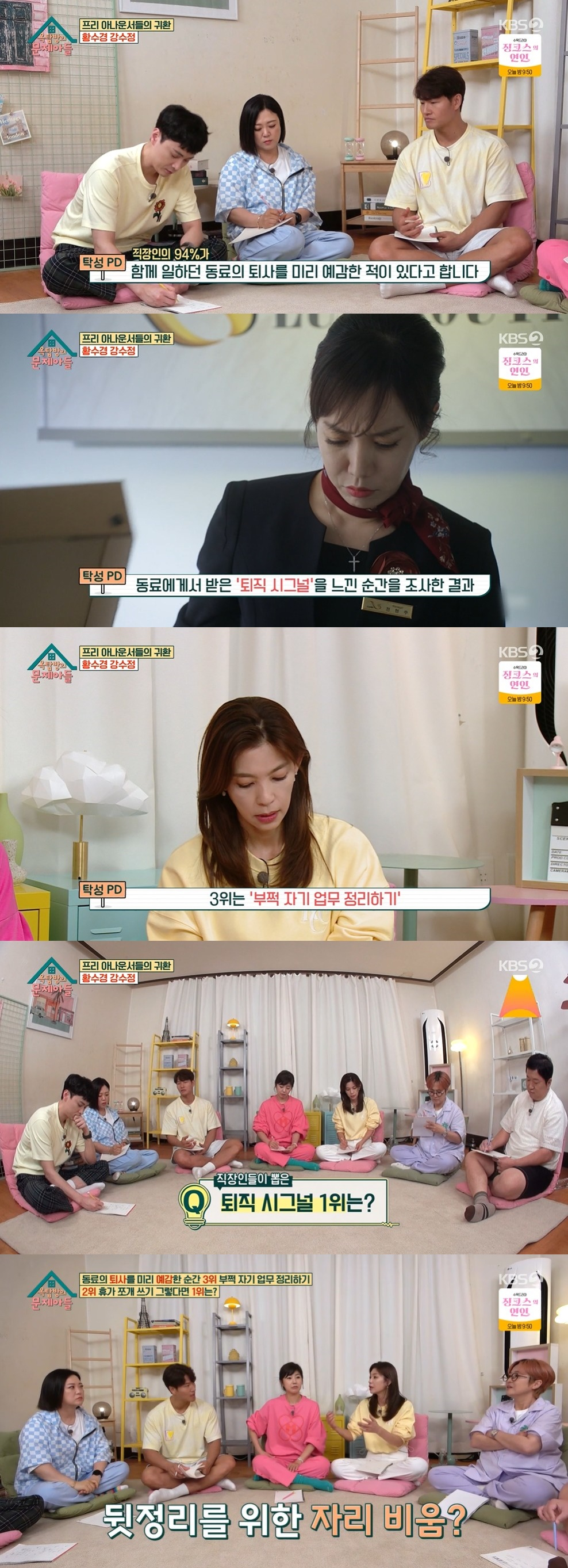 이에 황수경은 "자리를 비우는 시간이 많아진다"라며 말했고 단 번에 정답을 맞혀 출연진의 감탄을 자아냈다. 이후 강수정은 퇴사 계획을 세웠던 이야기를 하며 직장인들의 호기심을 자극하는 에피소드를 공개했다.