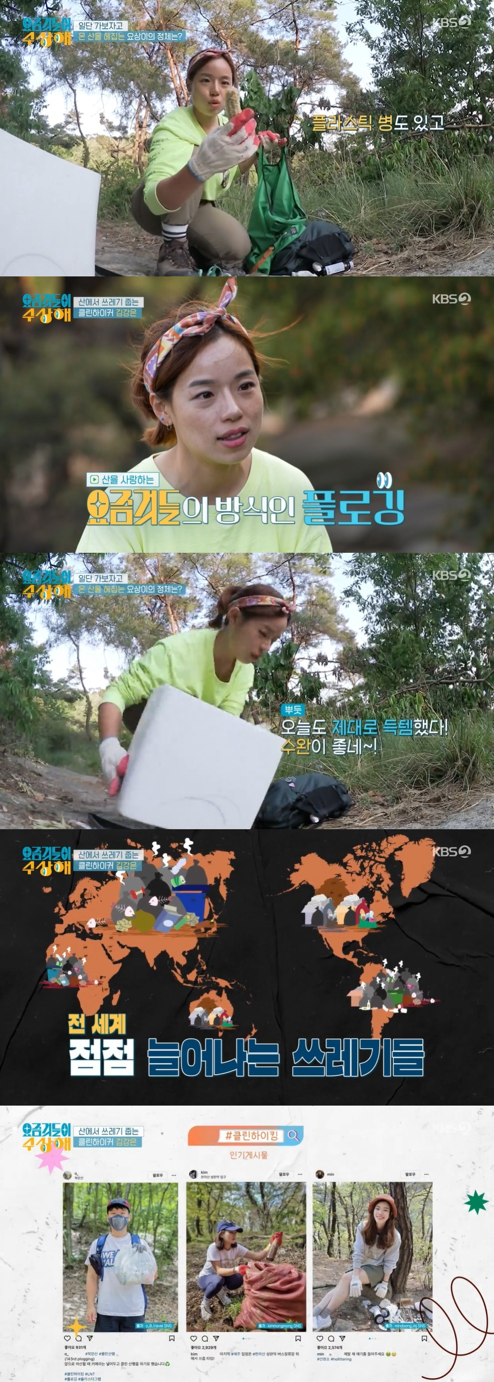 29일 오후 방송된 KBS 2TV 예능프로그램 '요즘 것들이 수상해'(이하 '요상해')에서는 출연자 김강은씨가 지구를 위해 쓰레기를 줍는 등산 활동인 '클린 하이커'에 대해 설명하는 모습이 담겼다.