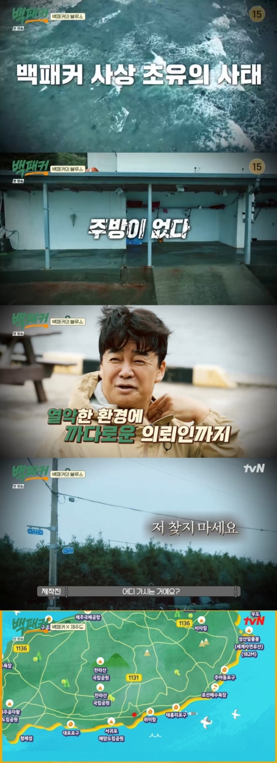 이날 방송에서는 제주 해녀들이 의뢰인으로 소개됐다. 우중충한 날씨의 제주를 바라보던 백종원은 주방이 어디에 있는지 물었다. 이에 해촌 계장님은 공터를 가리키며 "여기서 하시면 돼요"라며 백종원을 당황시켰다. 빈 공터에 조리 환경이 갖춰지지 않은 공간을 보며 백종원은 "여기가 주방이에요?"라며 당황했다.