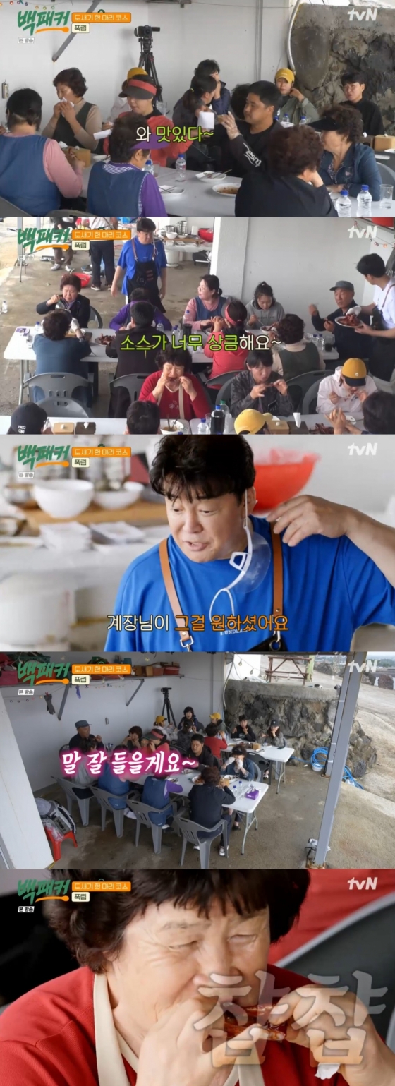 우여곡절 끝에 완성한 요리를 해녀분들에게 대접하면서 백종원은 "약간 부끄럽다. 해녀분들 음식 정말 잘한다"라며 걱정했다. 다행히 해녀분들은 "맛있다", "너무 부드럽다", "귤 향이 난다"라며 좋아하는 모습을 보였고 백종원이 안심했다.