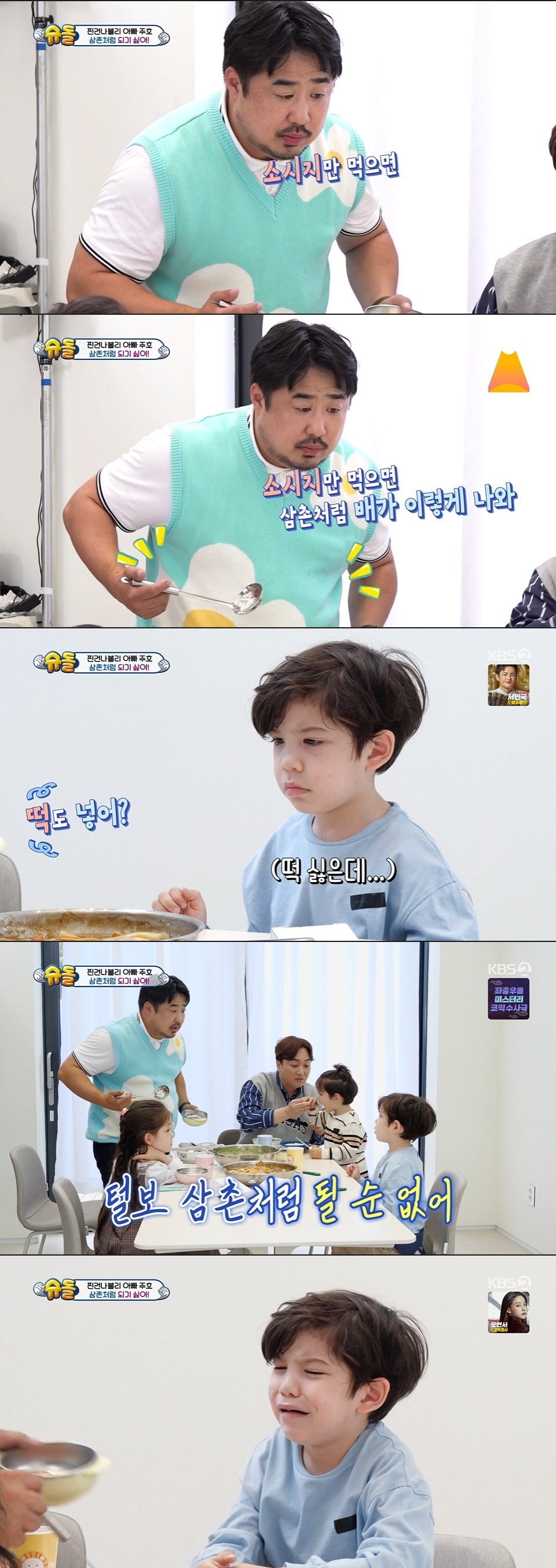 이후 강재준은 아이들을 위해 떡볶이를 준비했다. 건후는 떡볶이를 보며 "떡볶이 싫어"라며 투정했다. 황제성은 "그럼 건후는 뭐 먹고 싶어?"라며 의견을 물었고, 이에 건후는 "고기, 밥"이라 답했다. 강재준은 건후를 위해 소시지만 골라줬다.