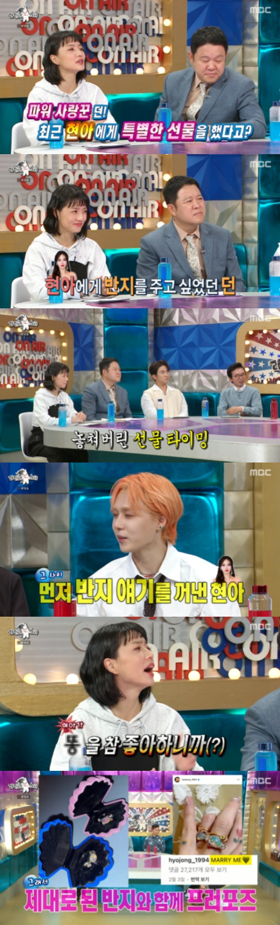 이어 안영미는 던이 최근 현아에게 프러포즈 반지를 선물한 것을 언급했다. 던은 "이미 반지를 만들었는데 현아가 갑자기 '근데 왜 우리는 반지 안 해?'라고 묻더라 당황해서 '무슨 반지야'라고 했었다"라고 말했다. 이어 "현아가 삐져버려서 제가 그날 풀어주려고 '반지를 일단 가져와야겠다' 생각하고 가져왔는데 근데 사이즈가 안 맞았다. 하필 반지 디자인도 똥이었다"라며 안타까운 상황을 전했다. 하지만 던은 얼마 후 제대로 된 반지와 함께 프러포즈를 했다고 전했다.