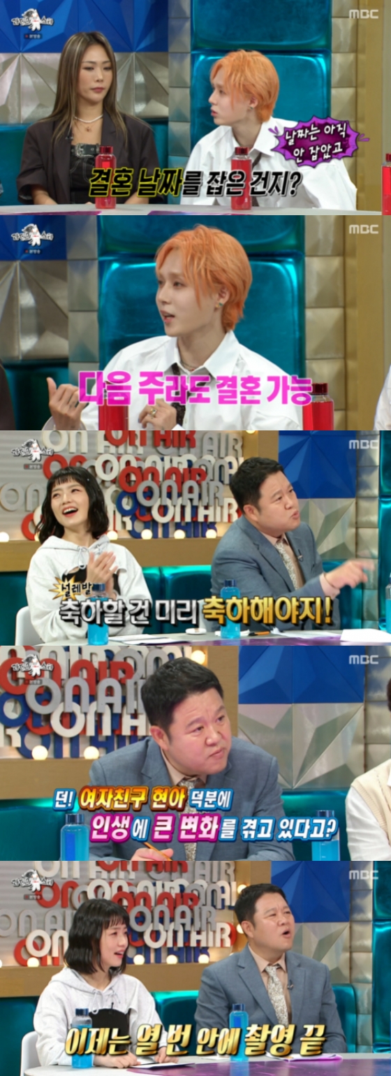 이에 김국진은 "날짜는 잡은 건지"라고 질문했고, 던은 "항상 결혼은 현아랑 해야겠다고 생각한다"라며 사랑꾼의 모습을 보였다. 이어 "저희는 결혼하고 싶으면 다음 주에 해도 되는 성격이다"라며 서로에 대한 확신을 보였다. 김구라는 "축하할 건 바로바로 축하해야 된다"라며 박수를 보냈고 모두가 박수로 축하해 줬다.